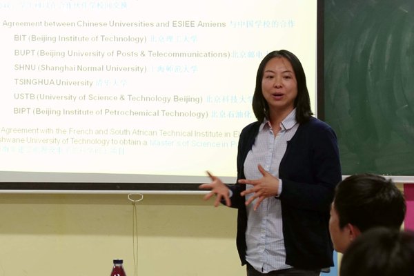 之后,法方项目负责人为大家介绍了ESIEE-Amiens的基本情况、专业设置、主要课程、就业方向等,对暑期课程、毕业设计项目、攻读硕士学位项目的具体内容以及注意事项也进行了一一介绍,并对同学们提出的问题进行了解答。