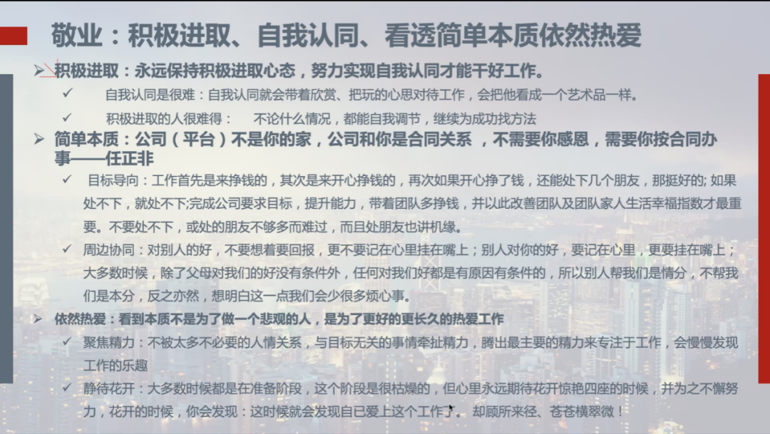 敬业爱业是自己对一份工作热爱并坚持的表现。学长认为,在工作中保持积极进取的心态,努力实现自我认同才能做好自己的工作;此外,认识工作的简单本质,明确自己的工作目标,不被太多不必要的人情关系所牵扯精力,要专注于当前的工作,在工作中逐渐体会其中的乐趣。