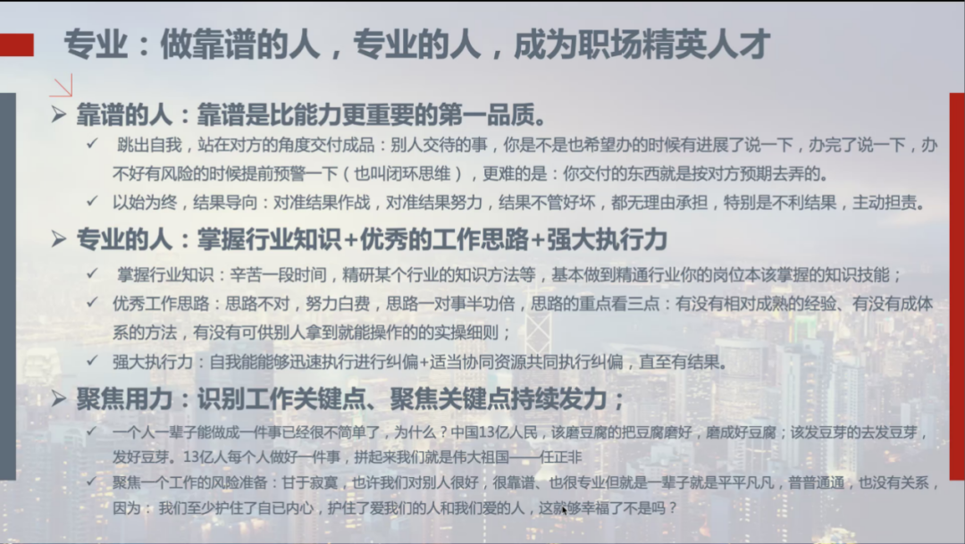 做一个靠谱、专业的人——这是对个人所提出的要求。学长指出,在职场中,靠谱是比能力更重要的第一品质。所谓靠谱,就是能拥有闭环思维,在一个项目或者事情中,及时、认真地给发起人反馈,既拥有参与者的责任心,也要有团队的配合力,还要注意人际关系的敏感性。在一项工作任务中,要以始为终,结果导向,对准结果努力,结果无论好坏,都要勇于承担。所谓专业,就是能够精通自己岗位所应该掌握的知识技能,同时通过平常的点滴积累,形成自己的优秀工作思路,此外还能拥有准确迅速执行一项工作并及时纠偏的能力,直至有结果。