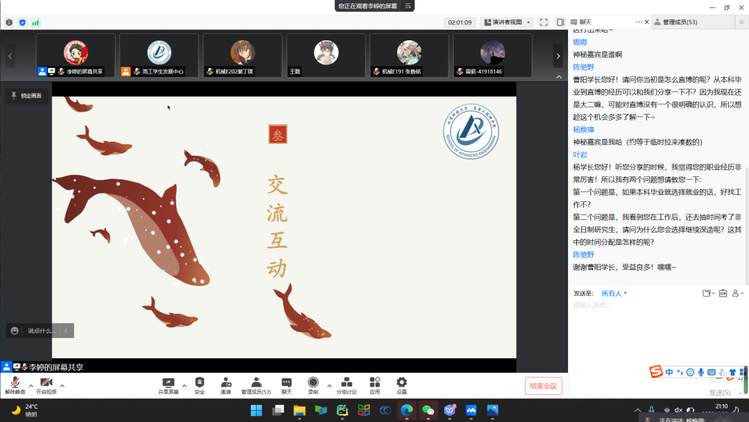 最后,曹学长分享了自己的几点感悟。他鼓励大家去思考如何成长为一名合格的当代青年,实现自我和社会价值;他还向大家强调了成长经历的重要性,希望大家不要急功近利,要一步一个脚印去成长;作为新时代的大学生,曹学长认为,我们自己应当有担当,要善于发现问题并举一反三,尝试从更高层面思考问题。