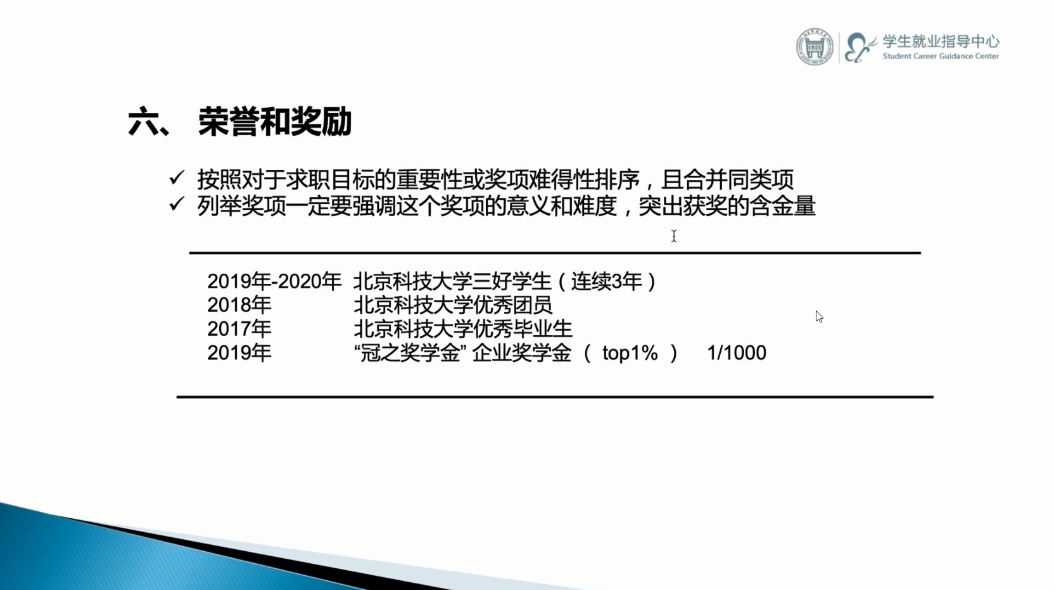 李婷还指出,技能与特长主要指英语和计算机,应当结合岗位需求灵活填写;荣誉和奖励需要注意排序、合并,强调奖项的难度和意义;其他内容指个人爱好、自我评价等,可作为简历空白填充,应当慎重填写。