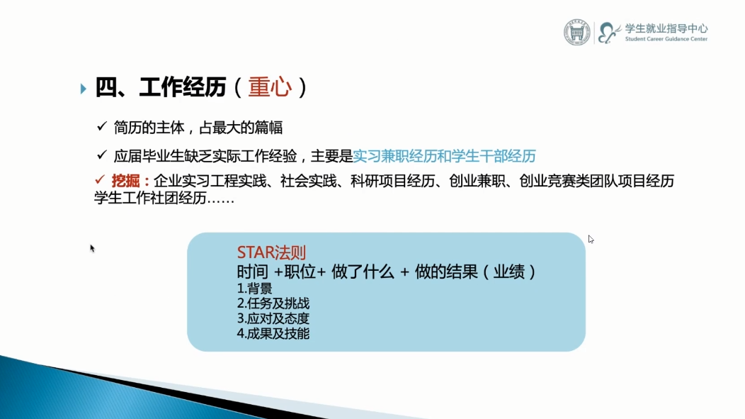 李婷强调,工作经历是简历重心,应当占最大的篇幅,内容主要是实习兼职经历和学生干部经历,可根据自身情况深入挖掘,并按照“STAR法则”简明、扼要地叙述。