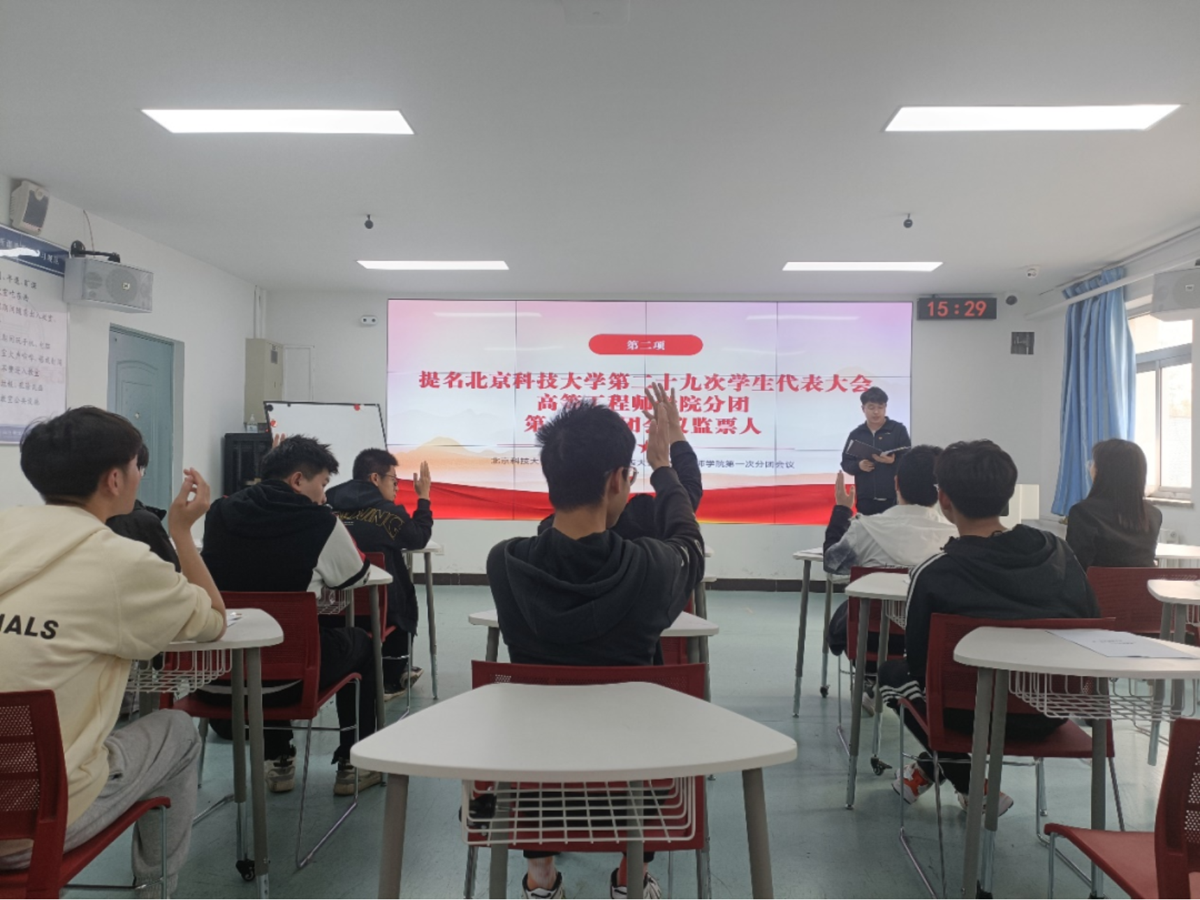 随后,会议推选了好色tv 第二十九次学生代表大会好色tv 分团第一次分团会议监票人,经好色tv 团委讨论建议柯名希担任本次会议监票人,与会代表举手表决,全票通过提议。