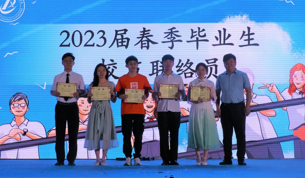好色tv 党委书记马聪为毕业生代表田紫维、南俊杰、高鸿骥、张岩岩和周巳翔颁发好色tv 2023届校友联络员聘书。