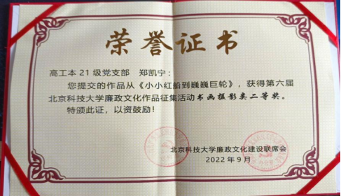劳逸结合,方得始终。大一期间,我参与了宿舍科创节,与舍友一起精心准备科技小制作和节目表演;参与了模拟政协提案大赛,为学校建设提供自己的想法;参与了“峥嵘岁月”新中国历史展答题活动,回顾历史、启迪今天。在为集体的奉献中发挥特长爱好也是自我价值实现的一种很好途径,我参与班级的班徽班旗设计,为班级的第二名贡献力量。我参与了廉政文化作品征集活动,为党支部收获书画摄影类二等奖。