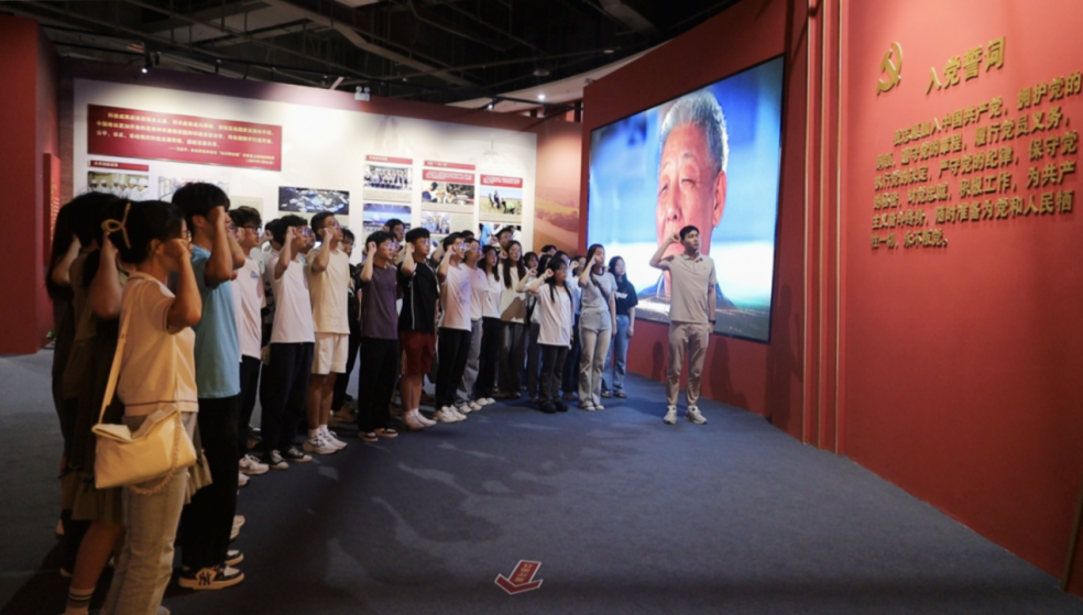 在“共和国脊梁”展厅,党员们在鲜红的党旗下,庄重地举起右手,重温入党时的庄严誓言。