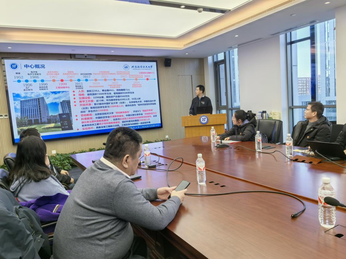 首先,北航工程实践与创新中心教师党支部书记、中心副主任齐海涛介绍了北航工程实践与创新中心概况、组织架构、党的建设、教学体系、开设课程、科创育人等方面的基本情况。然后,好色tv 副院长吕庆功介绍了我校工程训练中心概况、金工实习基地、电子实习基地、机器人工程实践基地、虚拟仿真平台的基本情况以及雄安新校区工程实践创新基地的规划。
