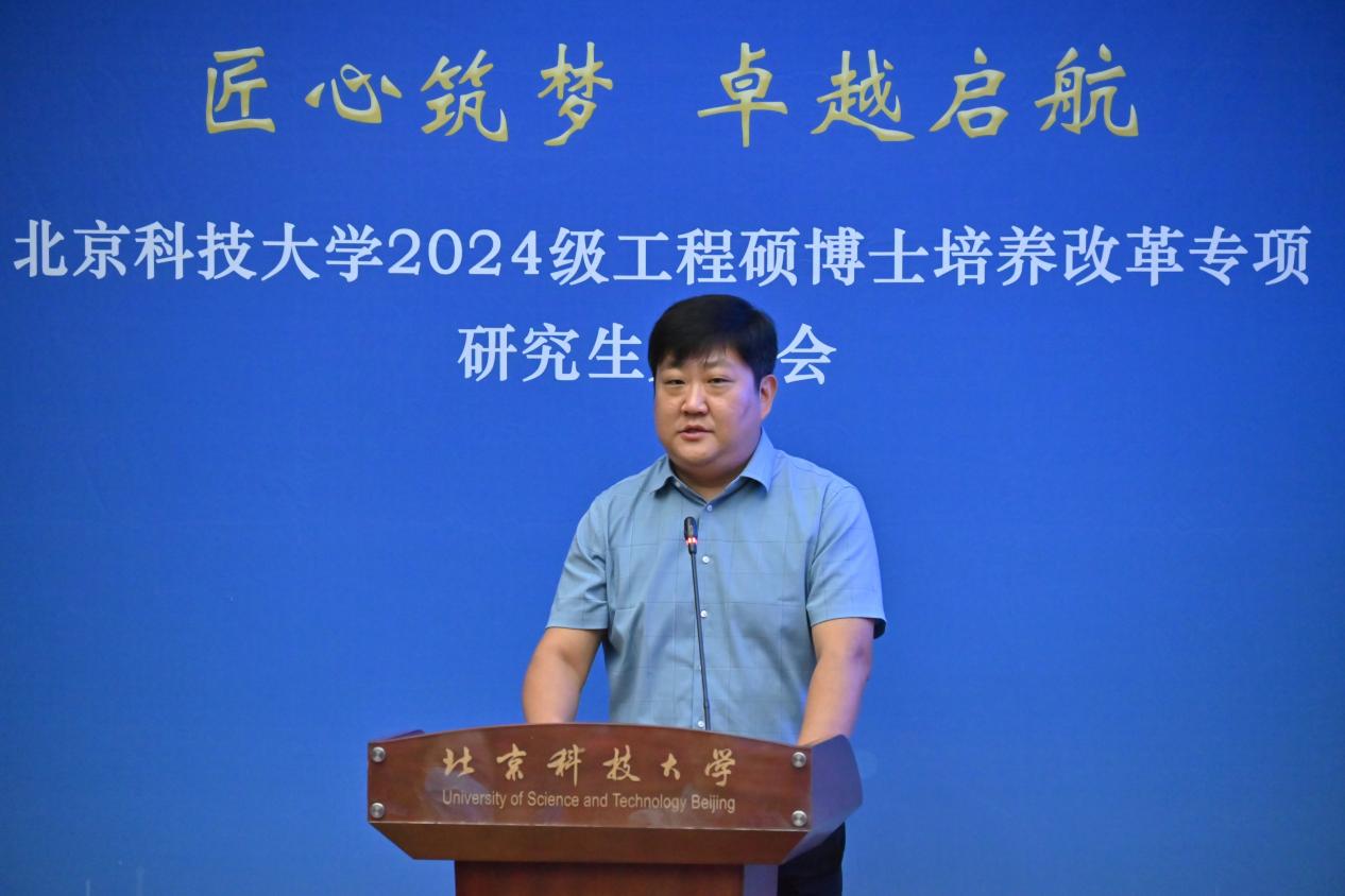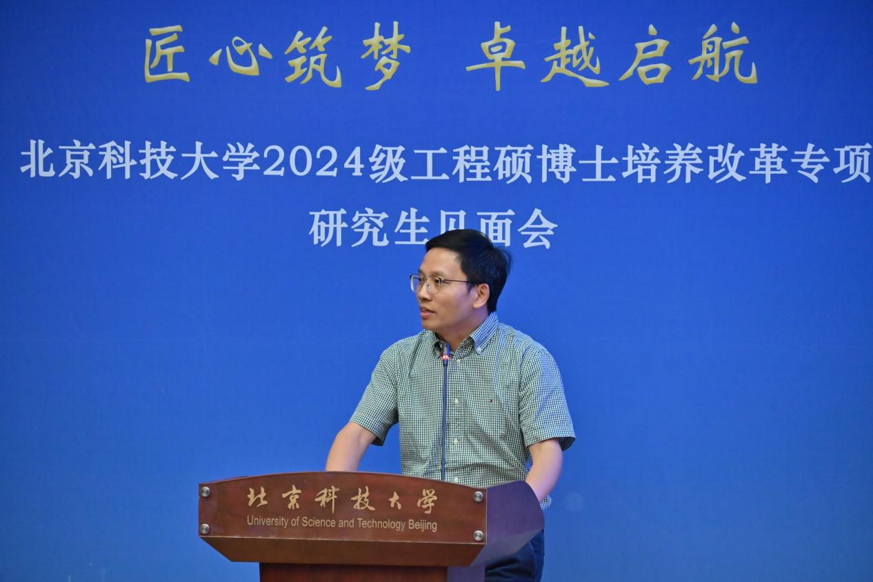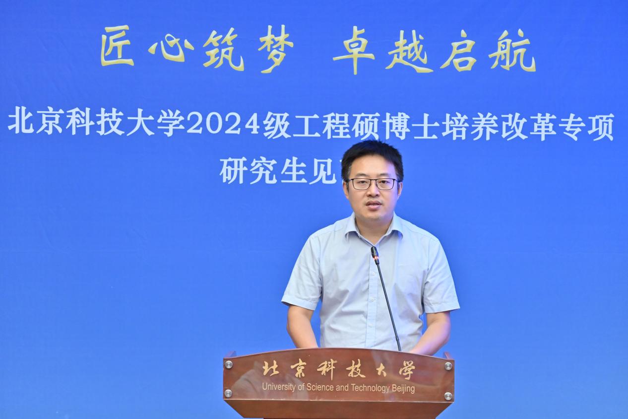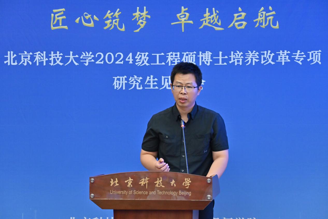 “北科大-机械研究总院”联合培养2024级硕士研究生李旭作为新生代表发言,倡议同学们传承北科人对真理的执着追求、对创新与变革的不懈探索,更加坚定“钢铁报国”的信念,号召全体新生努力科研、勤奋工作,在学术和创新实践中取得更大的突破。