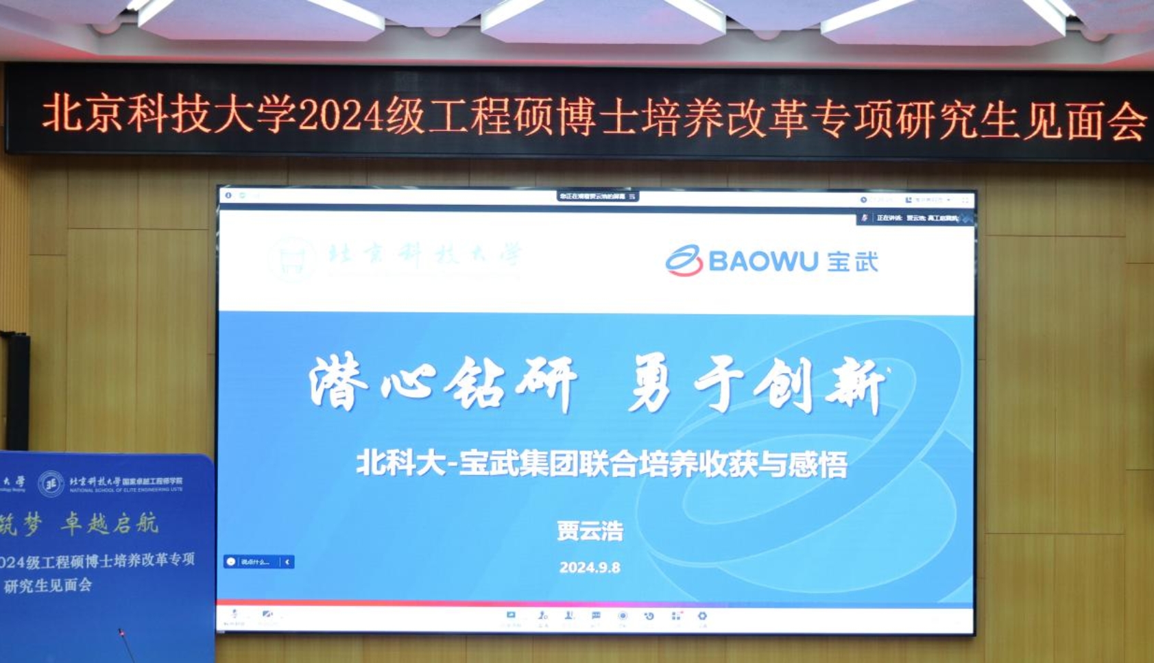 “北科大-宝武集团”联合培养2022级硕士研究生贾云浩、“北科大-五矿集团”联合培养2022级硕士研究生李文聪,分别通过线上、现场方式分享了自己和同学们在企业学习、实践、生活的经历,与企业导师、同事的学习相处情况,专业技术与能力提升情况,建议新生们潜心钻研理论知识,勇于创新、知行结合,真正实现从书本到实际的转换,将丰富充实的工程实践经历转化为成长财富。