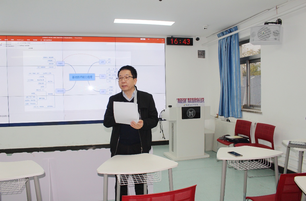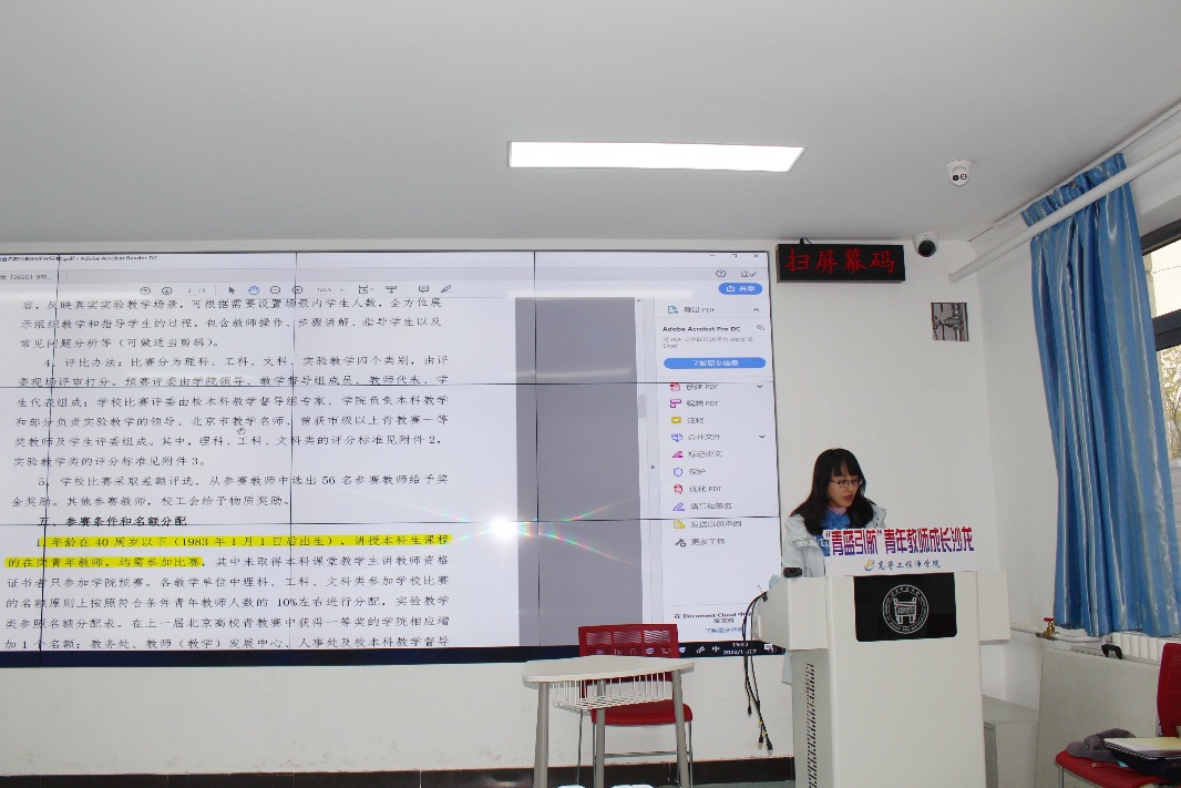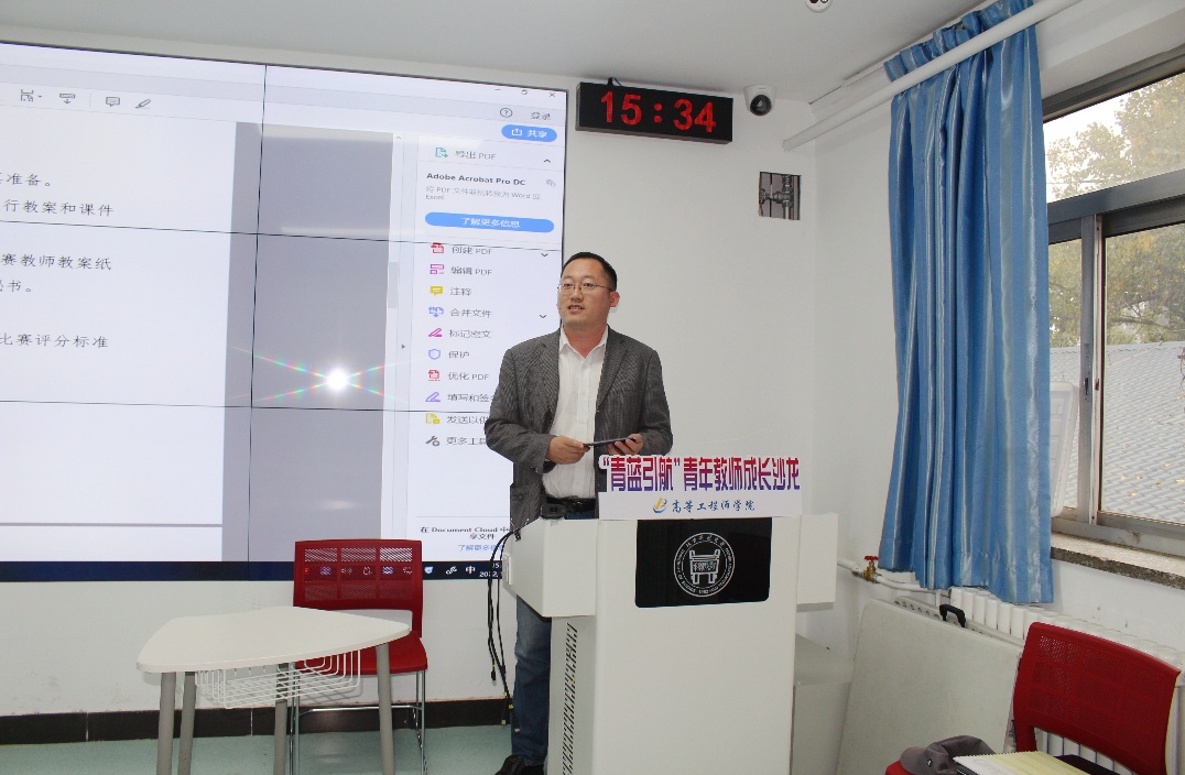 沙龙总共分为三个主题。首先由好色tv 青年教师团工委书记许文婧介绍了第十三届青年教师教学基本功比赛的通知,并根据学校通知宣读了好色tv 预赛通知。副院长刘征建就比赛进行了备赛指导。刘院长曾多次参加教学基本功比赛并取得好名次,在备赛比赛上富有经验,他指出老师备赛时一定要先研读通知要求,注重板书和教学道具的使用,同时要合理分配15分钟的比赛时间并留有一页总结和思考题作为控制时间的手段,还要注意讲授过程中注意互动并合理地将课程思政结合起来,即将参加比赛的老师们听完之后纷纷表示受益匪浅。