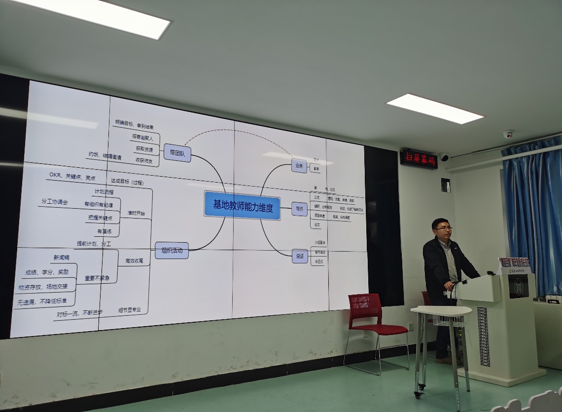 沙龙第二个主题是由电子基地负责人白艳茹围绕“中国高校智能机器人创意大赛教师赛”一等奖参赛获奖经历进行业务能力提升、团队建设专题分享。白老师作为参赛团队负责人,以参赛PPT为引导,给大家介绍了赛事概况和参赛的经验总结。她指出在参赛过程如何灵活应对各种挑战,在编写比赛相关教学材料文件的注意事项,在比赛中整个团队的业务能力和团结合作提升情况,同时也就教学体系、模式、方法和手段等方面归纳总结,与在座老师进行分享。