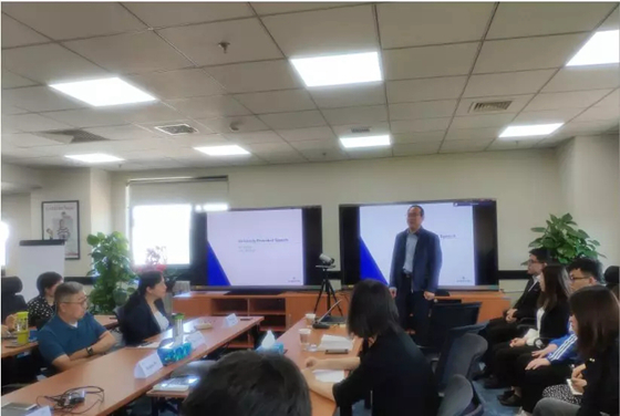 在简短的介绍和欢迎后,北科大校友艾默生过程控制有限公司副总裁商光文先生分享了在艾默生工作27年的经历和心得,对艾默生的发展情况给学生们进行了整体介绍。
