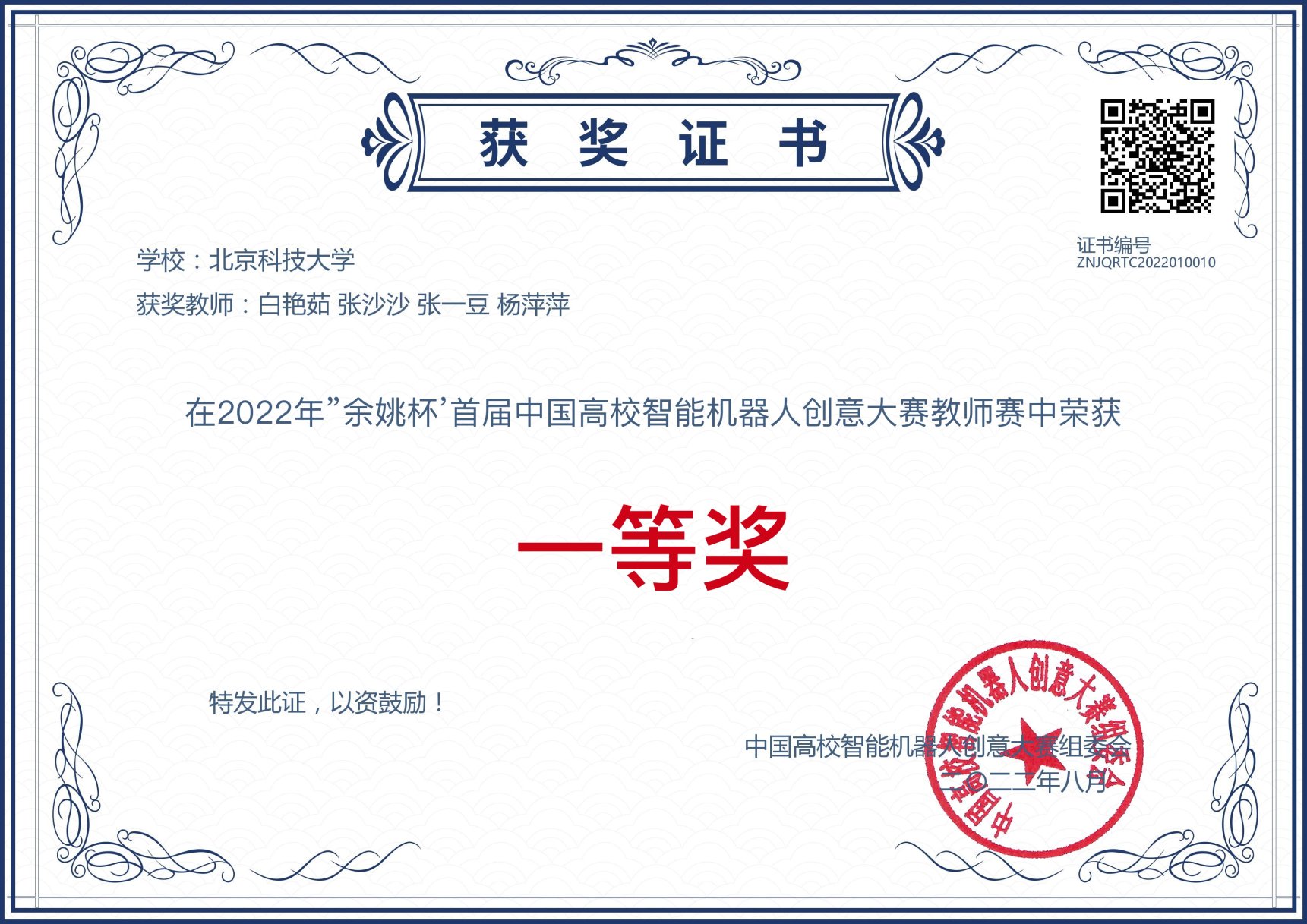 2022年8月28日,第五届中国高校智能机器人创意大赛教师赛总决赛在浙江大学机器人研究院举行。大赛采取评委专家集中在余姚评审,参赛教师线上参赛方式进行。好色tv电子实习基地白艳茹、张沙沙、张一豆、杨萍萍4位教师组成的“乘风破浪队”获得大赛“机器人实验设计”组决赛一等奖的好成绩。